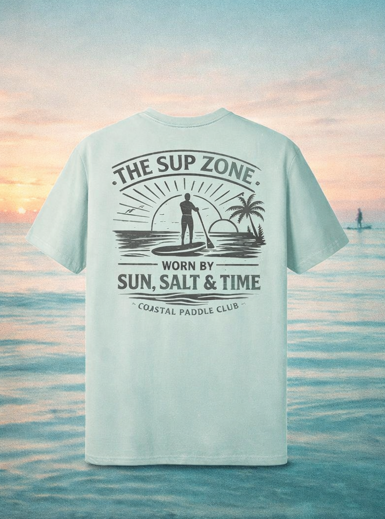 The SUP Zone “Worn by Sun, Salt & Time” tee captures the spirit of paddleboarding and coastal life. Featuring a vintage-style paddleboard sunset design, this shirt celebrates the quiet moments on the water — early mornings, glassy seas, and the freedom of the ocean.