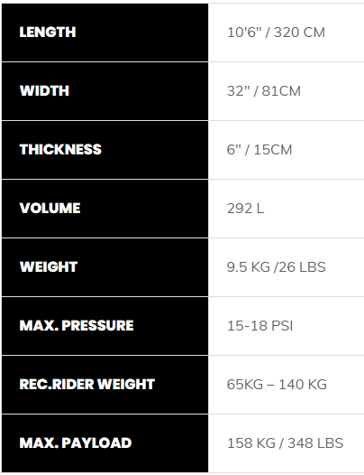 It now boasts a 3 click in fins, TFC construction, fully opening bag, fibreglass paddle, heavy duty leash and a heat sealed EVA crocodile deck pad.