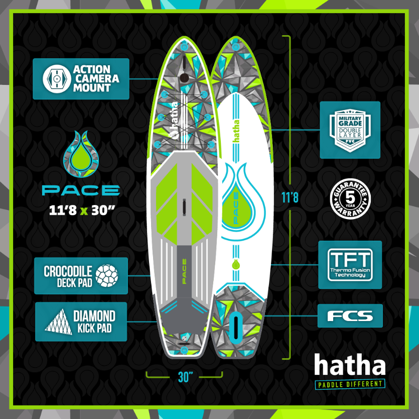Fancy something a little different then jump onto the all new Pace. If your feel your not quite ready for the Hatha Stride and want something a bit faster and longer then the Oxygen then this is the board for you. It is 11’8 in length, 30 inches wide and 6″ deep. Its a packed with features you would expect from Hatha such as a rear kicker pad, action camera mount, fiberglass paddle, FCS touring fin, US box fin box,double pump. Its made from our military grade PVC using our Thermo Fusion Construction making this board super light weight without compromising durability or strength.